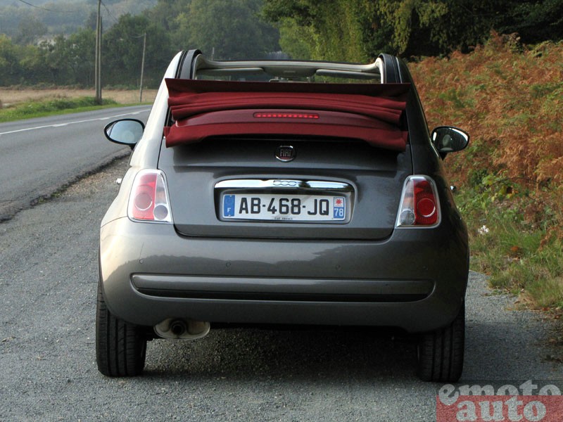 La capote s'ouvre électriquement en deux positions principales. Elle s'ouvre en grand et sur une position intermédiaire accessible lors de l'ouverture ou de la fermeture. Lorsqu'on la referme, on peut trouver une autre position intermédiaire plus adaptée lorsque l'air devient plus frais où qu'on roule plus vite. Les manipulations de la capote doivent se faire à vitesse réduite mais pas nécessairement à l'arrêt, on peut donc profiter d'un embouteillage pour prendre le soleil. Si elle n'est pas totalement cabriolet mais juste découvrable, la petitesse de l'auto fait qu'on se sent tout de même au grand air, surtout à l'arrière en raison des montants inclinés. Cette configuration limite beaucoup les flux d'air dans l'habitacle, alors si vous êtes amateurs de vent dans les cheveux, vous serez peut-être déçus car la Fiat 500C ne le permet pas réellement. Lorsqu'elle est grand ouvert, la capote repliée masque complètement la vue dans le rétroviseur central par contre, le volume du coffre est préservé, cela évite de prévoir ses bagages en vue de décapoter, s'ils rentrent dans le coffre, c'est bon capoté ou décapoté !