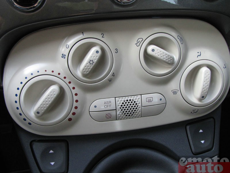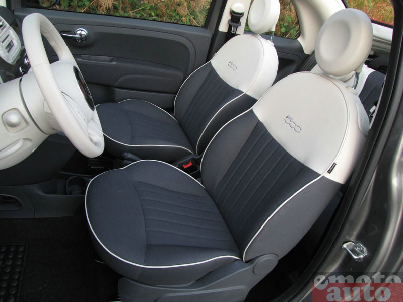 de la Fiat 500C rappellent l'époque de sa devancière avec un certain soin. Les sièges en tissu anthracite avec le passepoil beige clair, du même ton que les éléments en cuir, donnent une touche lumineuse résolument estivale à cette petite 500C. La place dévolue au passager et au conducteur, qui profite d'un volant cuir, est assez spacieuse. Les teintes claires participent bien entendu à ce sentiment. L'arrière est toujours aussi réduit avec ses 3.55m de long. A l'extérieur, la capote en toile lui donne un cachet résolument rétro et fait tourner toutes les têtes, même quelques mois après sa sortie. Petite touche amusante, il est possible (en option) d'ouvrir ou de fermer la capote à la télécommande de l'auto !