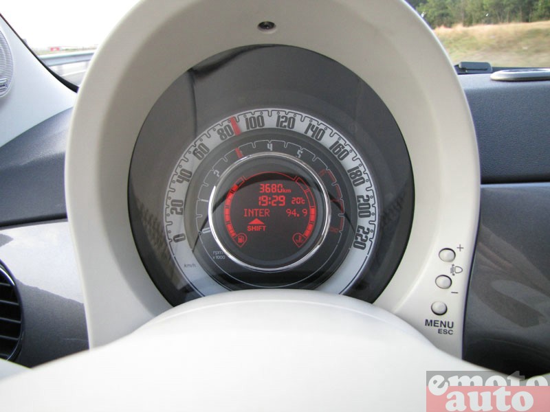 La 500C essayée est équipée du moteur essence 1.2L de 69ch. Avec sa boîte à 5 rapports et sa fonction Start&Stop, cette motorisation est idéale pour la ville où elle apporte la facilité de conduite et un fonctionnement qui reste assez discret. Pour la route, sans doute que la motorisation est un peu juste surtout en reprises lorsqu'il s'agit de doubler, mais en adoptant une conduite décontractée qui va très bien à la 500C, c'est suffisant. En roulage mixte elle affiche une consommation de 6 litres aux 100km sur l'ordinateur de bord et Fiat annonce 113g de C02/km. On peut optimiser sa consommation en suivant les indications de changements de rapports qui permettent de rester dans la plage idéale de régimes moteur en fonction des conditions de conduite.