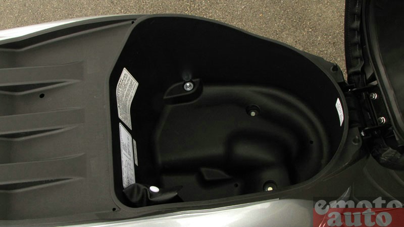 Un petit vide-poche fermant à clé est présent dans le tablier. Il n'y a pas de prise 12V ni dans le vide-poche ni dans le coffre. Le coffre non éclairé et rond, est assez vaste pour accueillir sans souci un casque intégral ce que ne permet pas un scooter grandes roues