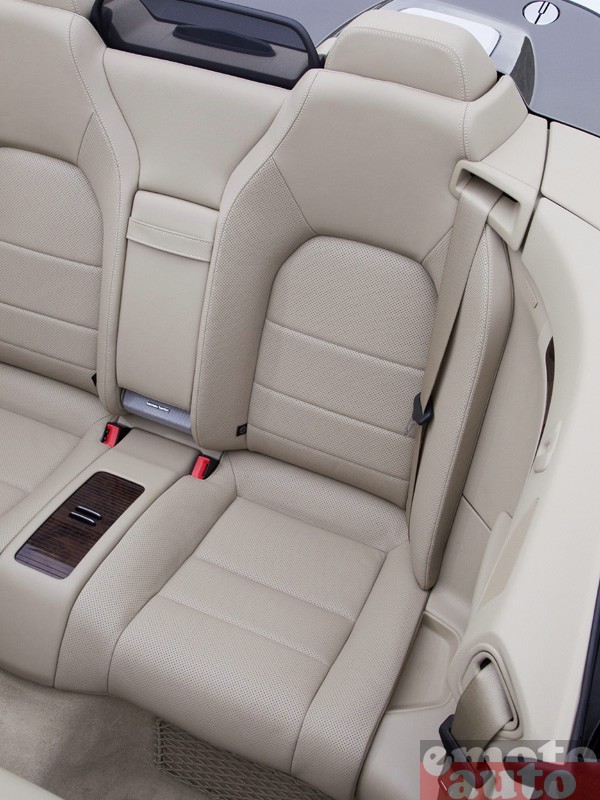 Le principal intérêt de cette Classe E Cabriolet, en plus de sa ligne à la fois moderne par son coup de crayon et traditionnelle avec cette jolie capote en toile, réside bien dans le fait de pouvoir profiter des joies d'un cabriolet à quatre adultes. En effet, contrairement à de nombreux cabriolets quatre places où les deux à l'arrière ne conviennent qu'à un enfant en raison du manque de place pour les jambes, la Classe E sait recevoir ! Même en mesurant 1m80, on n'a pas les genoux dans le dossier du siège avant et l'ergonomie du siège est excellente. Il ne manque que le chauffage de nuque (Airscarf) ou les sièges chauffants pour être au même niveau de confort qu'à l'avant. En plus de l'Airscarf qui maintenant s'oriente, Mercedes innove en proposant le fameux Aircap découvert en même temps que ce cabriolet. Kesako l'Aircap ? Ce déflecteur se déploie tout en haut du pare-brise sur toute sa largeur, pour créer un flux d'air protecteur pour les 4 places. A l'avant, les petits mouvements d'air qu'on pouvait sentir disparaissent. A l'arrière, c'est encore plus perceptible puisque le flux d'air gagne environ 20cm en hauteur et protège parfaitement en mesurant environ 1m65. Au-delà , les remous existent toujours un peu tout en étant fortement atténués, mais ceci dépend bien entendu de votre taille de buste ! Enfin, pour mieux se protéger ou s'exposer à l'arrière, on peut baisser ou remonter les deux appuie-têtes ainsi que le filet anti-remous. Celui-ci est lié aux appuie-têtes et masque un peu la vue dans le rétroviseur central lorsque la capote est fermée. S'il y a une climatisation séparée à l'arrière, il faudra par contre demander gentiment au conducteur de manoeuvrer ces appuie-têtes, lui seul (et le copilote