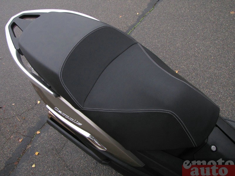 L'assise du Peugeot Geopolis propose une place bien définie entre la pente formée par la selle légèrement surélevée du passager et la bosse sur le devant qu'on ressent lorsqu'on ressert les jambes. Celle-ci oblige à s'asseoir au fond, impossible donc pour les petites jambes de s'avancer sur le devant de la selle. Les pieds trouvent uniquement leurs places sur les emplacements anti vibrations du plancher, mais la forme du bas du tablier permet de les avancer un peu et donc d'avoir les jambes moins à l'équerre que sur un autre grandes roues