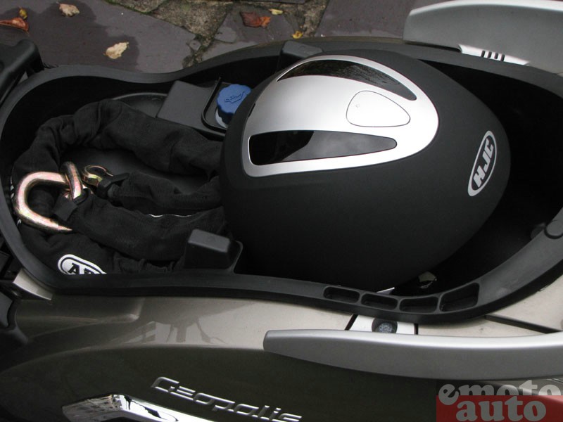 Le tablier du Peugeot Geopolis 125 accueille un vide poche qui ferme à clé. Il est assez grand et est doté d'une prise 12V pour recharger son téléphone. Sous la selle, le coffre est assez long et contraste avec les emplacements plus ronds