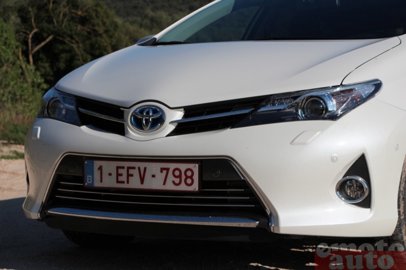 Hybride ou pas, l'Auris suit la tendance de l'année en étant plus légère (-70 kg pour l'hybride), plus basse de 5.5 cm et mieux profilée pour un meilleur aérodynamisme. Même la garde au sol est abaissée de 1 cm. L'empattement est inchangé pour cette auto qui gagne 3 cm. On le remarque nettement de profil où la voiture paraît bien plus élancée que sa devancière. La ceinture de caisse et le pare-brise plus inclinés vers l'avant accentuent cette impression générale. Le style se veut plus sportif avec à l'avant, une calandre inférieure trapézoïdale à la bordure chromée, des optiques affinés avec une discrète paupière chromée à l'intérieur en complément des feux diurnes ainsi qu'un logo agrandi et abaissé à l'extrémité du capot mis aux normes des chocs piétons. L'arrière laisse apparaître de nombreux angles et une lunette arrière assez réduite en hauteur qui limite d'ailleurs un peu la visibilité dans le rétroviseur central. Les feux arrière sont eux aussi affinés comme à l'avant et viennent chapeauter le galbe prononcé des passages de roues. On remarque enfin le becquet désormais intégré au hayon. A la base de la poupe sous l'imposant bouclier, on retrouve un dessin trapézoïdale rappelant celui de la nouvelle calandre.