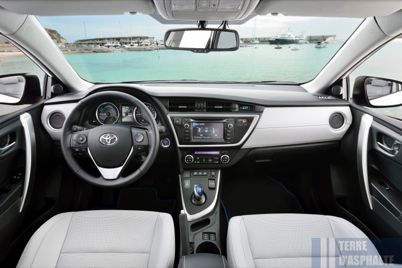 La chaine cinématique est strictement identique à celle de l'Auris berline en combinant un moteur 4 cylindres essence de 1800 cm3 à un moteur électrique capable de faire rouler notre Toyota à lui seul ou en complémentarité. La transmission ne se fait pas par une boite de vitesses automatique classique mais par un système à variation continue. Le passage entre les modes thermiques et électriques, ou la combinaison des deux, est automatique et d'une discrétion absolue. On ne le perçoit pas à moins de jeter un oeil sur les différents synoptiques disponibles au tableau de bord et sur l'écran de la console centrale. En montagne on roule assez souvent en tout électrique dans les descentes, comme c'est le cas en ville si on opte pour une conduite en douceur. En descente, le mode B est préféré au mode D car il permet de profiter de plus de frein moteur tout en rechargeant plus rapidement la batterie. Lorsqu'on part à l'assaut des sommets ou qu'on adopte un rythme plus soutenu, on retrouve dans l'habitacle la sonorité du moteur essence qui prend beaucoup de tours lors de franches accélérations. La faute à son faible couple et au variateur. Même si l'auto est assez dynamique, cette caractéristique n'est pas très agréable à l'oreille. La conduite n'est malgré tout pas désagréable sur ces routes pleines de virages, même si l'amortissement arrière est un peu plus ferme en raison de la charge qu'est supposée emporter notre Touring et que le guidage mériterait d'être plus incisif. L'adjectif Touring va bien à notre Auris, celui de Sports un peu moins tout simplement parce qu'on n'a pas les prestations ni les lignes d'un break de chasse par exemple. Ce qui n'empêche pas notre Auris Touring Sports d'être particulièrement apte à un usage quotidien intensif avec un agrément global très réussi.