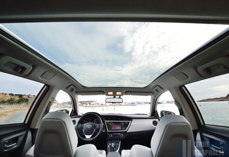 . Le gros plus est à chercher dans le coffre avec une belle modularité. Certes son volume en configuration normale n'est pas le meilleur avec 530 litres, mais toutes banquettes repliées, il est actuellement le plus grand de la catégorie avec 1658 litres. Pour passer d'une configuration à l'autre et profiter d'un plancher plat, rien de plus simple, il suffit d'utiliser la tirette en haut du dossier ou plus facilement directement dans le coffre. On remarque au passage que la ceinture de sécurité n'entrave pas du tout la remise en place du dossier, ce qui est loin d'être le cas dans toutes les autos, break ou pas. On note aussi des astuces avec le plancher qu'il est possible d'abaisser très simplement, les petits compartiments dissimulés dans le fond du coffre et le cache bagage qu'on peut se mettre sur deux niveaux. La Touring Sports à l'avantage de son coffre par rapport à l'Auris berline, et ce n'est pas qu'un argument commercial, loin de là .