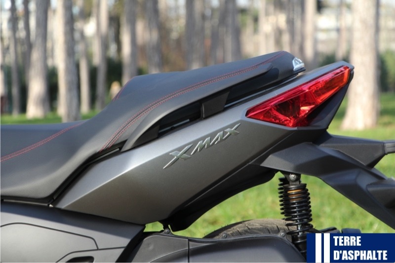 En effet, il n'est pas simple de distinguer les X-Max 125 et 250, ni même le nouvel X-Max 400 de face pour la simple raison qu'ils sont, cette année, strictement identiques. On retrouve donc une nouvelle optique plus déterminée, des clignotants qui remontent à l'extrémité du carénage et le plastron noir à la base du pare-brise. Celui-ci est maintenant plus protecteur mais il n'est toujours pas le meilleur de la catégorie en restant trop bas et pas assez large. Les déflecteurs épargneront un peu les doigts des intempéries. Sur les flancs, le fameux boomerang n'est plus d'un coloris alu mais simplement noir. Ce qui change totalement, c'est l'arrière. Il est bien plus effilé et se termine par de volumineux feux à LED proéminents qui intègrent les clignotants. On remarque aussi les jantes avec des bâtons plus fins comme sur certaines motos sportives. La selle se rehausse de surpiqures rouges et le dosseret du pilote change un peu pour maintenir sans appuyer. La forme de la selle change peu. Si vous aviez les jambes trop courtes pour poser les pieds bien à plat à un arrêt en restant au fond de la selle, cela sera certainement toujours le cas.